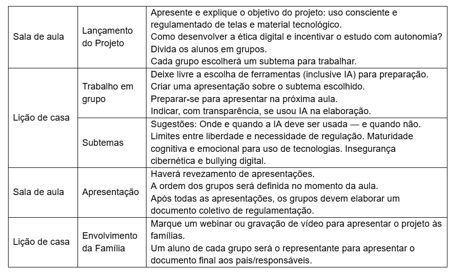 Sugestão de atividade – Projeto conscientização: peça para os alunos se dividirem em grupos, criarem uma proposta e estudarem a importância da educação digital. Siga as etapas.